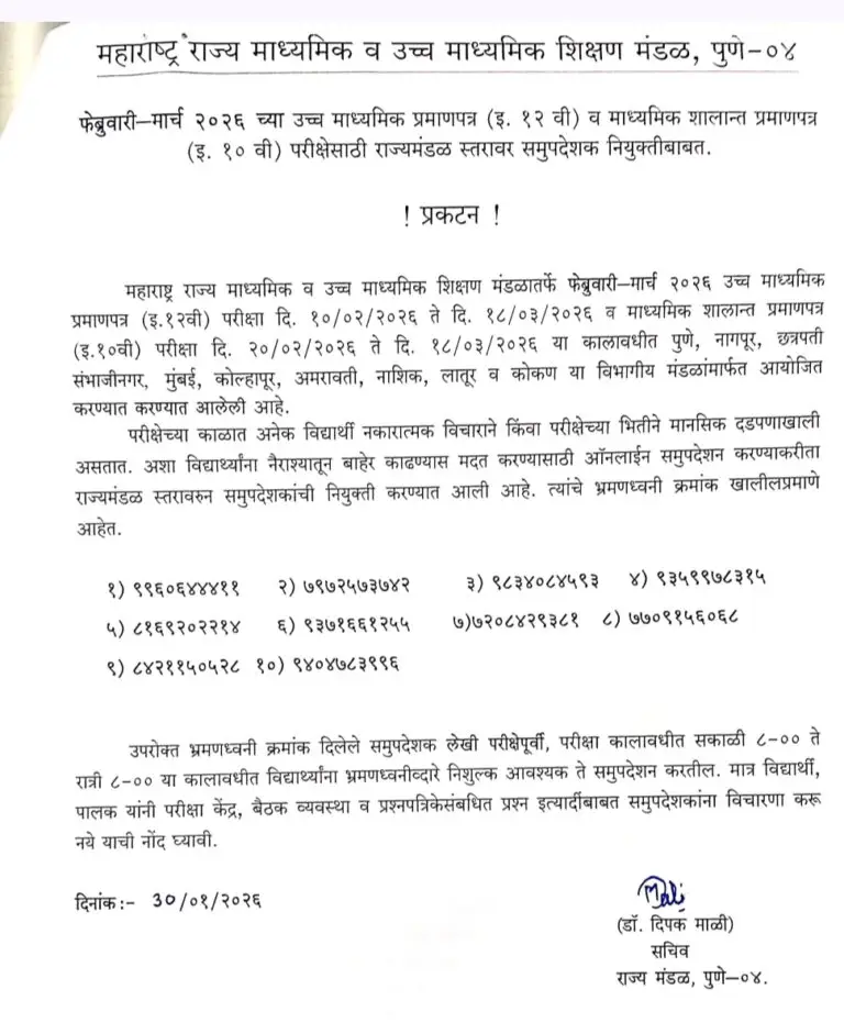 माध्यमिक व उच्च माध्यमिक प्रमाणपत्र परीक्षा फेब्रु-मार्च 2026 भयमुक्त, तणावमुक्त परीक्षेसंदर्भात विद्यार्थ्यांना व इतर घटकांना त्यांच्या अडीअडचणी सोडवता याव्यात यासाठी विद्यार्थी-पालक यांचेसाठी समुपदेशकांची नियुक्ती करण्यात आली असून आवश्यकतेनुसार पुढीलप्रमाणे समुपदेशकांशी संपर्क करता येईल, असे आवाहन विभागीय सचिव लातूर विभागीय मंडळ लातूर यांनी केले आहे.